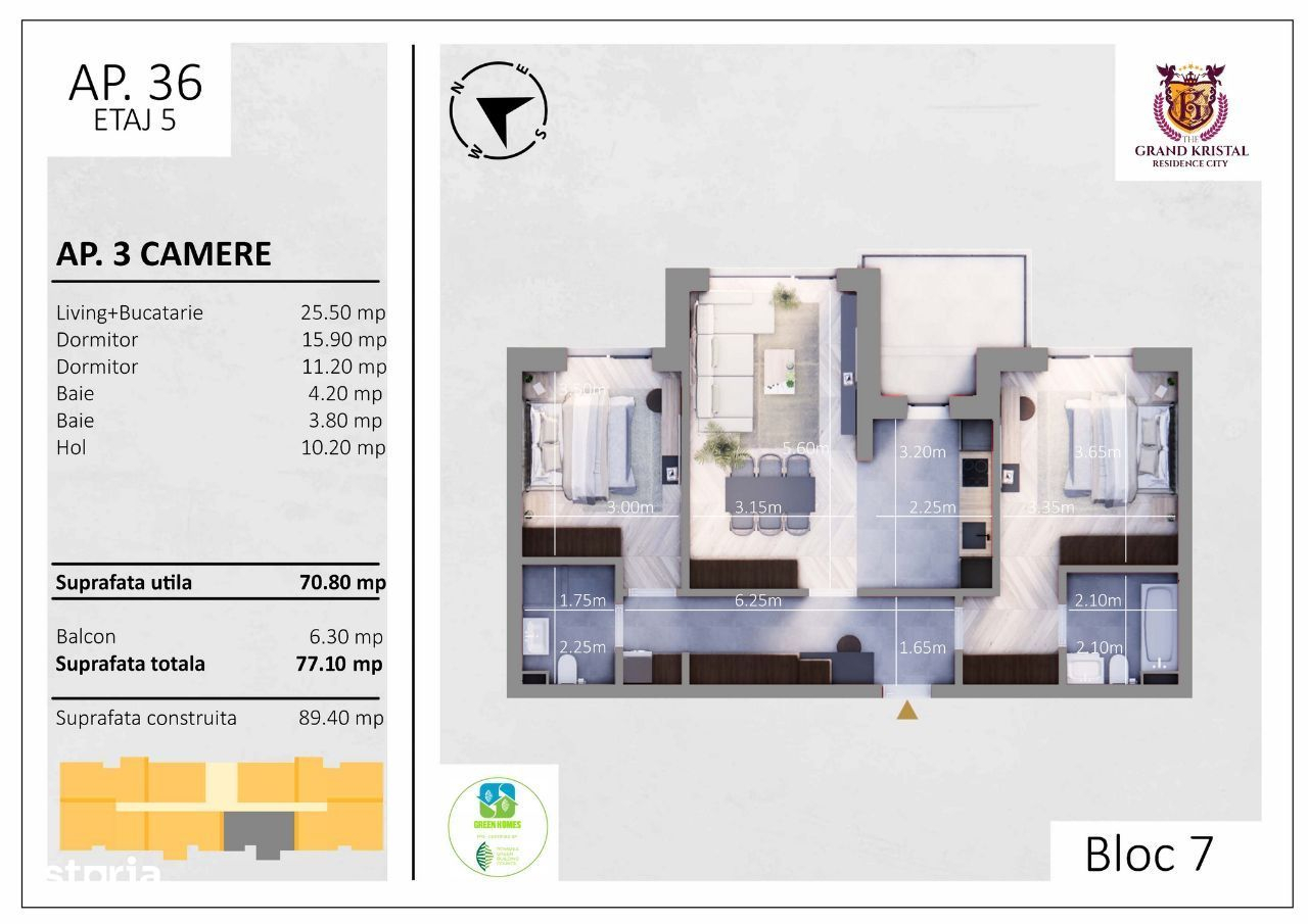 Va propunem spre vanzare un apartament cu 3 camere, situat in proiectul imobiliar?Kreisstadt Boutique Residence, un proiect modern din Sectorul 4, Bucuresti, ce beneficiaza de acces facil catre statia de metrou Aparatorii Patriei, centre comerciale, numeroase institutii de invatamant si zone verzi. Apartamentul are o?suprafata utila de 74.90 mp, la care se adauga un?balcon de 15.50 mp. Compartimentare inteligenta:? Hol 12.0 mp Living 18.25 mp Bucatarie 8.60 mp Dormitor 14.20 mp Dormitor 13.65 mp Baie 4.85 mp Baie 3.35 mp Dotari si finisaje premium: Incalzire in pardoseala, centrala proprie Tamplarie aluminiu cu geam tripan. Aer conditionat inclus Spatii aerisite si luminoase Materiale premium, design elegant si durabil Proiectul se bucura de o amplasare excelenta, la cateva minute de tramvaiele 1, 10, 11 si 34, cu acces rapid catre Autostrada Soarelui si principalele artere ale orasului. In apropiere se afla Delta Vacaresti,?Parcul Tudor Arghezi, Parcul Tineretului si Berceni Arena, alaturi de centre comerciale precum Sun Plaza Mall, Piata Sudului si Grand Arena Mall. Zona este deservita de numeroase hipermarketuri: Kaufland, Lidl, Mega Image si Carrefour. In vecinatate regasim institutii de invatamant (gradinite, scoli, licee) si unitati medicale importante, precum Spitalul Clinic de Urgente Bagdasar-Arseni. Pret de lista:?142.830?Euro + TVA? Aceasta proprietate se poate achizitiona prin?orice tip de credit bancar?sau prin?plata numerar. Daca inca nu stiti ce tip de credit este mai avantajos pentru dumneavoastra, departamentul nostru financiar Credit24h.ro va sta la dispozitie in vederea identificarii solutiei potrivite de finantare si intocmirii dosarului bancar pentru obtinerea creditului necesar achizitiei. Efectueaza rapid o simulare de credit online accesand linkul atasat si verifica-ti gratuit eligibilitatea:https://simulator.credit24h.ro/ Imaginile prezentate privind mobilierul, amenajarile interioare, dotarile, cat si variantele de finisare sunt propuneri de amenajare si mobilare ce pot fi executate cont- Caracteristici 30-07-2025