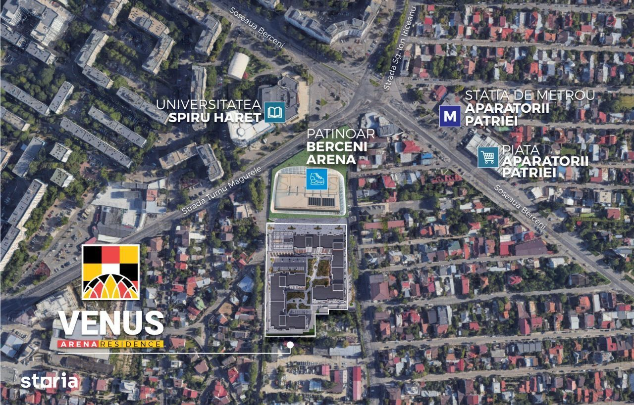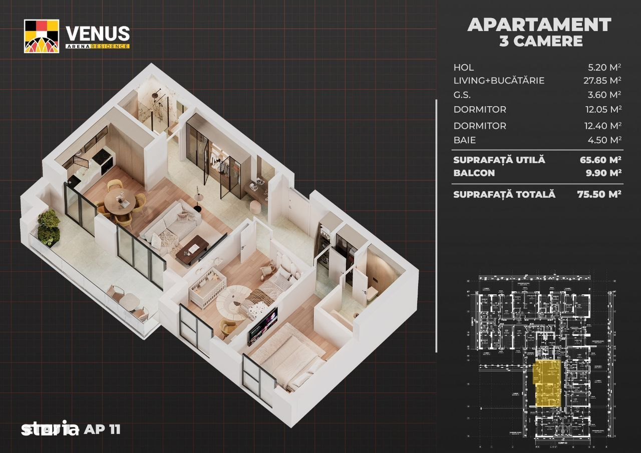 Va prezentam spre vanzare un apartament ideal cu 3 camere, parte din ansamblul?Venus Arena Residence, un nou proiect rezidential modern, bine structurat si pregatit sa ofere un stil de viata confortabil, intr-un cadru urban bine conectat la facilitati esentiale din Sectorul 4, Bucuresti. Locuinta este eficient compartimentata si ofera o suprafata totala de?75.50 mp, din care: Suprafata utila: 65.60 mp Balcon: 9.90 mp Compartimentare interioara optimizata:?hol 5.20 mp, living + bucatarie 27.85 mp, dormitor 12.40 mp, dormitor 12.05 mp, baie 4.50 mp, grup sanitar 3.60 mp. Balconul este accesibil din zona de zi si ofera o deschidere generoasa catre exterior, cu balustrada din sticla securizata pentru un plus de luminozitate si siguranta. Dotari si beneficii: Incalzire in pardoseala, cu reglaj individual Aer conditionat, inclus in pret Tamplarie PVC Salamander, tripan, culoare Gri Antracit - izolatie fonica si termica superioara Centrala termica de bloc, controlabila individual si sisteme ultramoderne MTH Lifturi Schindler?cu acces la toate nivelurile, inclusiv in parcarea subterana Finisaje premium, la alegere in showroom dedicat Balcon cu inchideri din sticla securizata, ideal pentru relaxare sau depozitare Venus Arena Residence?este un proiect rezidential de referinta, compus din?5 imobile?cu regim de inaltime?2S+P+M+6E, ce imbina designul modern cu utilitatea si accesibilitatea urbana. Fiecare bloc beneficiaza de?parcare subterana pe doua niveluri, lifturi rapide si acces la o zona comerciala proprie. Ansamblul?Venus Arena Residence?beneficiaza de o locatie excelenta, la doar cateva minute de mers pe jos de statia de metrou?Aparatorii Patriei, intr-o zona urbana moderna si complet dezvoltata. Puncte de interes si acces: Acces rapid la?metrou, linii STB si bulevarde principale: Brancoveanu, Obregia, Metalurgiei Pasajul Europa Unita?- fluidizeaza traficul si ofera legatura directa cu centrul orasului Aproape de?Sun Plaza Mall,?Grand Arena Mall,?Metro,?Auchan,?Selgros,?Lidl,?Carrefour Piata Aparatorii Patriei?- produ- Caracteristici 31-07-2025