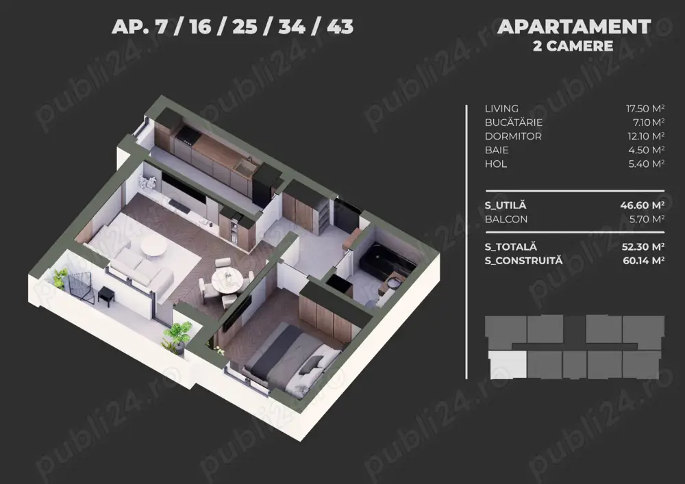 Apartament 2 camere compartimentare eficienta, balcon generos Vision Residence Brancoveanu 2, Sectorul 4, BucurestiVa prezentam spre vanzare un apartament excelent cu 2 camere, ideal pentru locuinta proprie sau investitie, situat in cadrul ansamblului Vision Residence Brancoveanu 2, localizat in zona Str. Postalionului Grand Arena Mall, Sectorul 4, Bucuresti. Apartamentul este disponibil la etajul 2 5 al imobilului si are o suprafata utila de 46.60 mp, la care se adauga un balcon de 5.70 mp. Compartimentarea este practica si bine gandita:Living 17.50 mpBucatarie 7.10 mpDormitor 12.10 mpBaie 4.50 mpHol 5.40 mpBalcon 5.70 mpApartamentul se preda complet finisat, cu materiale moderne si de calitate superioara, inclusiv:Tamplarie PVC cu geam termopan, ce asigura izolarea termica si fonica excelenta. Finisaje interioare premium, moderne si atent executate. Contorizare individuala a utilitatilor. Centrala proprie de apartament. Imobilul este dotat cu lift modern, iar casa scarii este finisata elegant, cu placari ceramice si mana curenta din inox, oferind un plus de confort si siguranta. In cadrul ansamblului Vision Boutique, locatarii beneficiaza de doua tipuri de parcari auto, special gandite pentru a raspunde diferitelor nevoi: parcari supraterane si parcari acoperite, disponibile contra cost. Conectivitate excelenta si acces facil:Aproape de Bd. Metalurgiei, Bd. Obregia, Bd. BrancoveanuAcces rapid catre Pasajul Europa Unita si centrul orasuluiTransport public:STB linia 241, in apropiere de imobilAcces rapid catre liniile 125, 220 si 232Statia de metrou Aparatorii Patriei sau Constantin Brancoveanu, la cateva minuteZona excelenta pentru viata urbana:Tot ce ai nevoie, la doar cateva minute: Grand Arena Mall, Carrefour, Selgros, Hornbach, Lidl, Auchan, JumboParcul Tudor Arghezi este unul dintre cele mai moderne spatii verzi din Sector 4. Amenajat recent, parcul ofera o atmosfera placuta si relaxanta, cu alei pietonale, locuri de joaca pentru copii, aparate de fitness in aer liber si zone dedicate relaxarii in familie.- Caracteristici 28-04-2026
