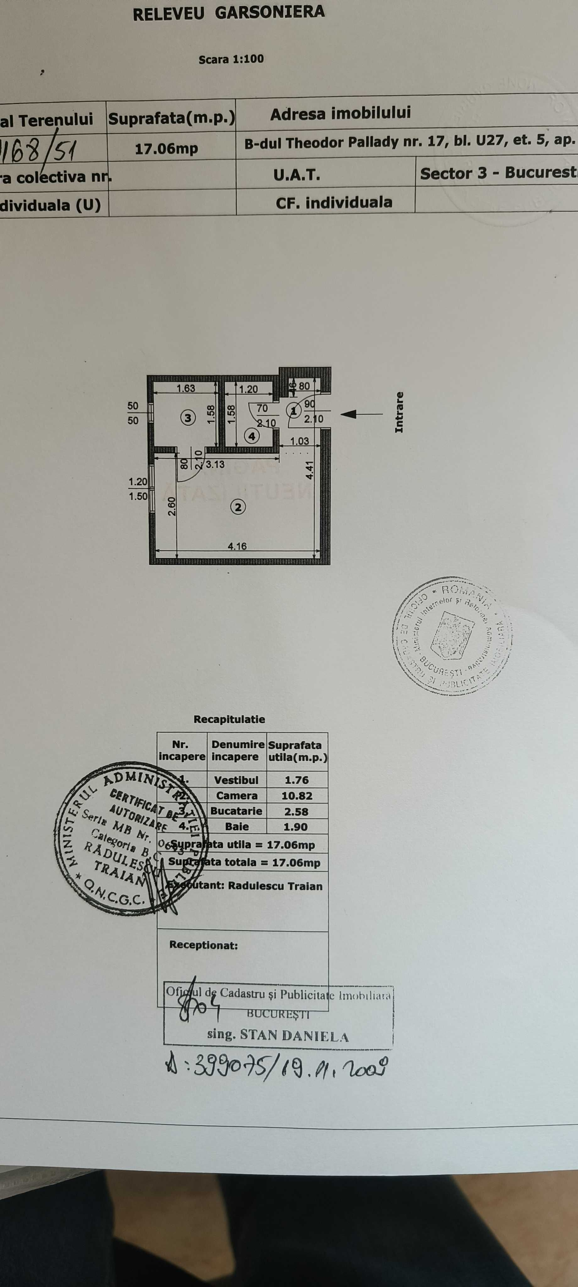 Proprietar vand garsoniera confort 2, de 17.1 mp, situata chiar la intersectia Bd 1 decembrie cu Bd Theodor Pallady., blocul U27, Piata Trapezului. Garsoniera se afla la etajul 5 din 10 al unui bloc reabilitat, cu lift, interfon, racordata la sistemul centralizat de caldura si apa, avand si gaze. Este mobilata cu canapea extensibila si utilata cu TV, plita, cuptor microunde, frigider, masina spalat, cabina dus. Vis-a-vis este statia de metrou 1 decembrie. La scara blocului se afla statia 613, 627, statia de tramvai (in reconstructie) Garsoniera este libera si are toate actele pregatite pentru vanzare. Blocul este construit in anul 1970 si are ceritifcat de performanta energetica A.- Caracteristici 19-04-2026