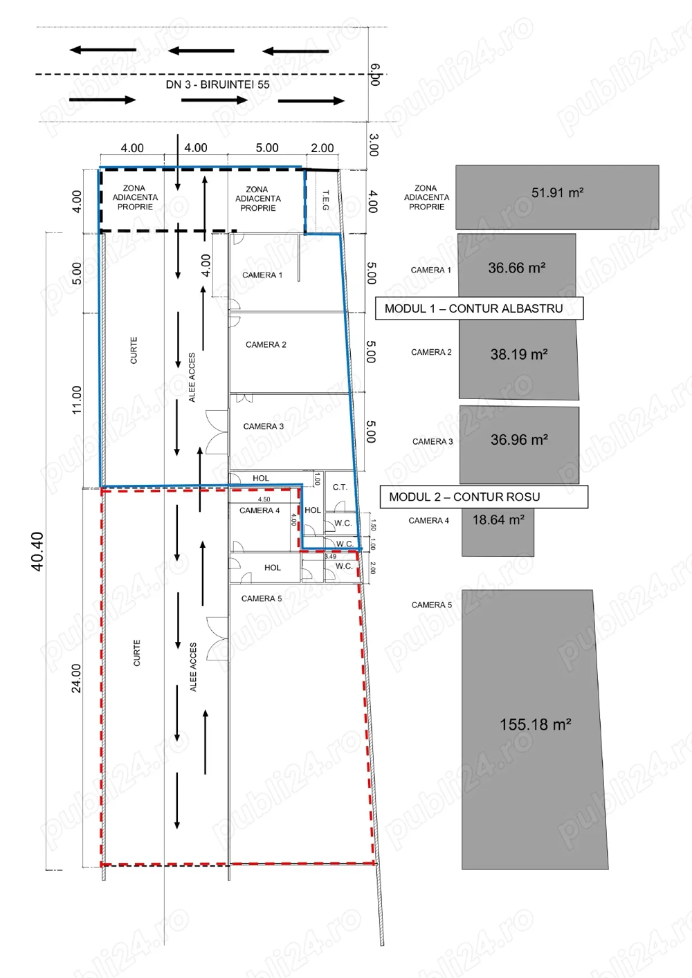 spatiu comercial, locatie stradala cu vad deosebit. se compune din trei incaperi. hala metalica usor reconfigurabiila in functie de profil suprafata utila modul 1 camera 1 36m2 camera2 38m2 camera 3 37 m2, zona adiacenta proprie la sosea 2 x 20 m2 curte adiacenta proprie ideala pentru parcare 64 m2grup sanitar dublu propriu- Caracteristici 24-04-2026